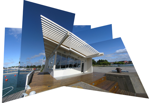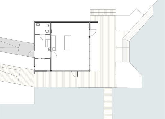 Byggnaden nås via ett trädäck med belysning och ett antal sittplatser. Trädäcket sammankopplar receptionsbyggnaden med gästhamnens bryggor och med byggnaden för gästhamnsservice. Däcket avslutas österut med gradänger att sitta i, som trappar ner mot vattnet och hamninloppet.