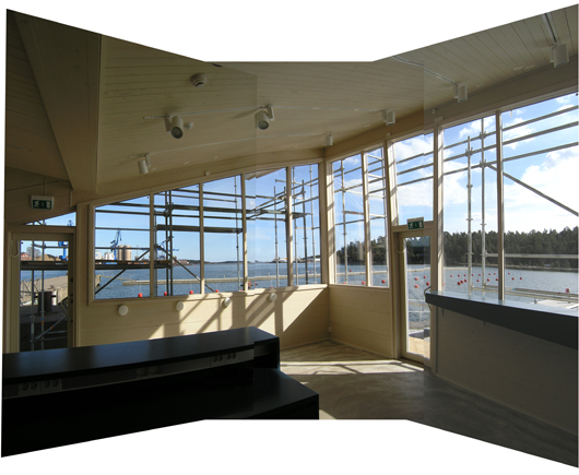 Den fasta inredningen är havsblå. Ett båtskrov har inspirerat oss till receptions- och cafédiskens form. En vattenyta i närbild laminerad på en glasskiva bildar fond åt reception och café.